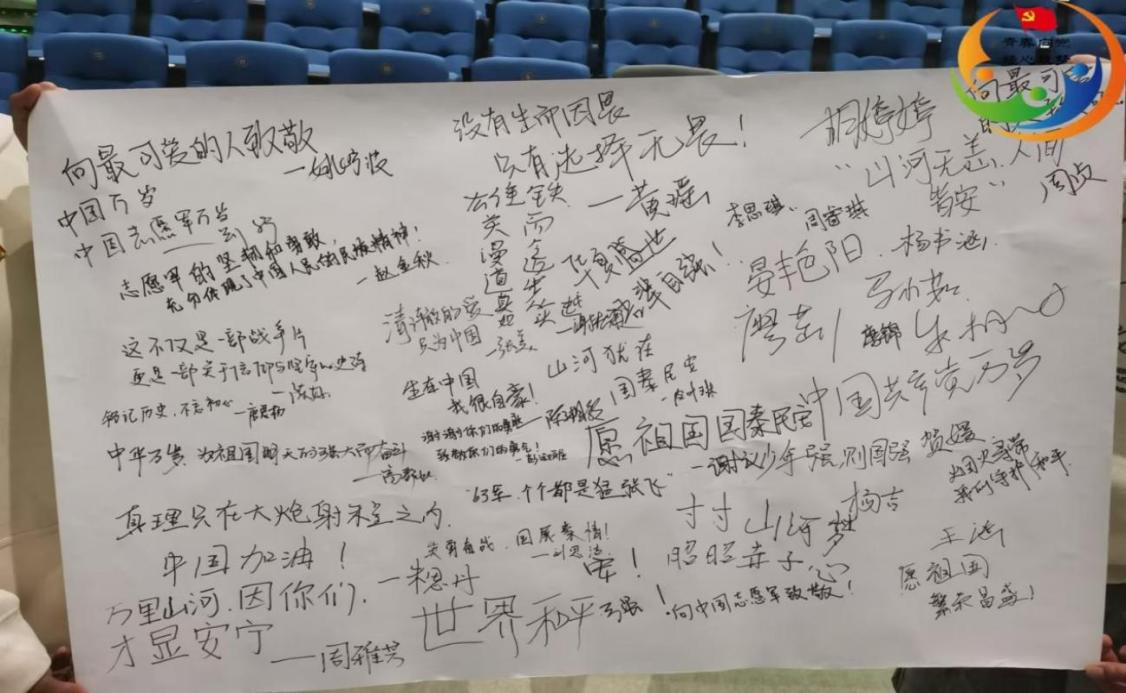 在观影结束的纪念签名环节,同学们纷纷拿起笔,在签名板上写下了对志愿军的敬意和自己的观影感悟。有的写下“向最可爱的人致敬!”;有的感慨“英雄不朽,精神长存,我们当铭记历史,珍惜当下”;有的畅言“寸寸山河梦,昭昭赤子心”……每一个签名、每一句感悟都饱含着对志愿军的崇敬之情。