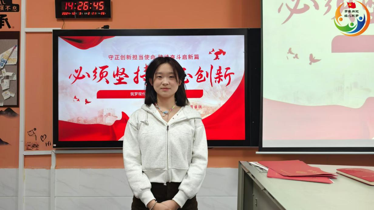 谈及大学生在守正创新方面的担当时,23级全媒体广告策划与营销1班郑婷分享道:“作为新时代的接力者,我们要在守正与创新上双管齐下。在守正方面,要在学业上秉持道德、思想上坚守核心价值观、实践上遵循客观原则,同时,在创新方面,要紧跟时代革新、实践探索发展新路径与方法,切实做到理论实践融合、推动创新发展,勇担守正创新之责!”