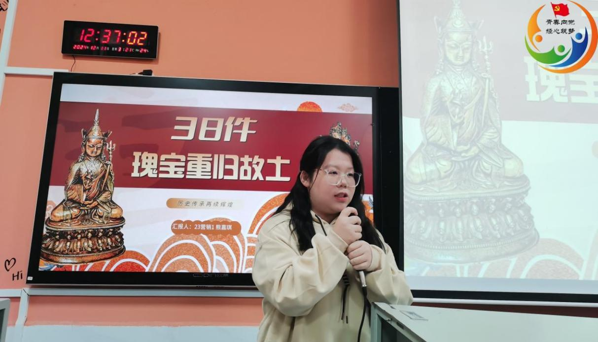 首先登场的是由23市场营销1班的熊嘉琪同学代表的“最佳视觉设计组”,他们将视觉与内涵完美融合,为在场同学呈现了一场关于38件流失海外文物重归故土的视觉盛宴。从文物背后的历史渊源,到回归之路的艰难险阻,再到它们重新展现在世人面前的辉煌瞬间……每一帧画面都饱含震撼与感动。