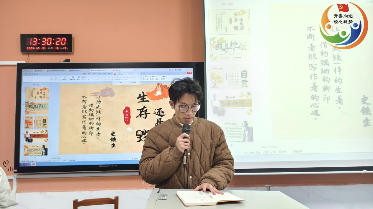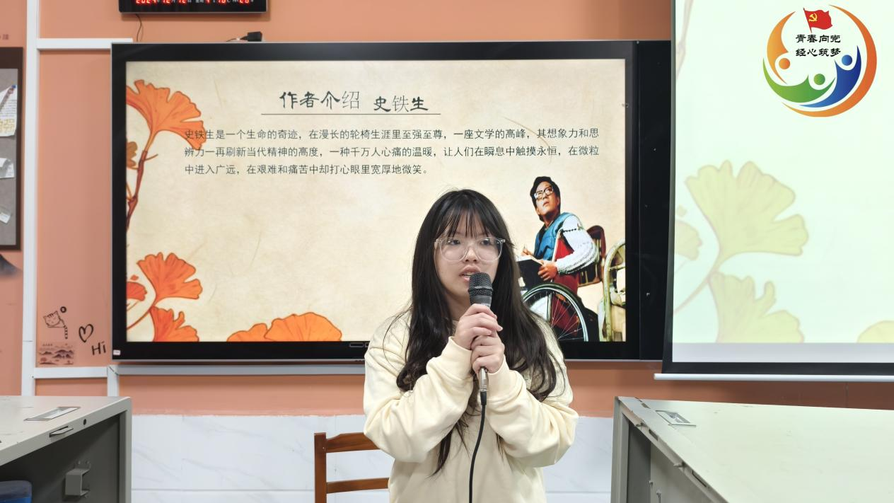 在分享的最后23全媒体广告策划与营销1班周雨萱同学也向同学们分享了她对《我与地坛》的见解:“在史铁生最艰难的时光里,地坛成为了他心灵的避风港。这座荒芜却又充满生机的园子,见证了他对命运的叩问,对生命的思索。我们常?;嵩谏钪性庥隼Ь常蛏硖宓牟⊥?,或心灵的迷茫。而史铁生告诉我们,即使身处黑暗,也要在寂静中寻找希望的曙光。”