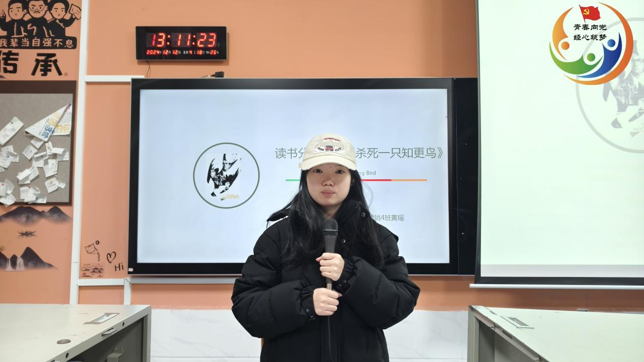 活动伊始,23 级市场营销4班黄瑶同学为同学们分享了哈珀·李的《杀死一只知更鸟》这本书,“在那个种族歧视盛行的年代,一只知更鸟的死去,究竟意味着什么?主人公是如何在冤屈里挣扎?”黄瑶同学说道,“作者哈珀·李用细腻的笔触,描绘出一幅关于正义、成长与人性的画卷。让读者在跟随主人公的视角探索真相的同时,也深刻感受到勇气与善良的力量,以及打破歧视枷锁的艰难与必要。”