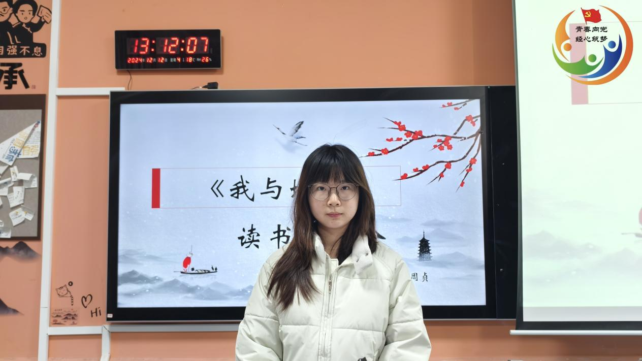 接着,23级市场营销(楚怡)1班周贞分享了史铁生的《我与地坛》?!段矣氲靥场方彩隽俗髡咴谒忍被竞螅氲靥辰嵯碌牟唤庵?。他在地坛中观察世间百态,思考生死、亲情、爱情等深刻命题。周贞同学以史铁生的经历告诉大家:“生命的磨难虽不可避免,但只要心怀敬畏与热爱,便能在困境中找到属于自己的精神家园。”
