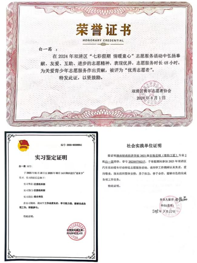 她就是来自23市场营销(楚怡工匠)2班的白一茜,曾获“优秀志愿者”称号。2024年暑假,她参加“七彩假期·情暖童心”志愿服务活动,关心农村留守儿童等群体,事迹被邵阳市电视台报道,这让她备受鼓舞,也更加坚定了投身志愿服务的决心。今年寒假,她再度踏上志愿服务之旅,用青春的担当与奉献,为家乡的冬日增添温暖。