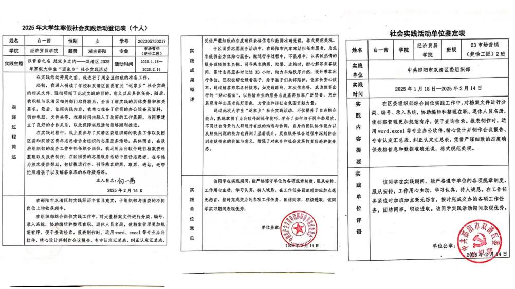 她积极响应家乡团区委的号召,投身于“以青春之名 赴家乡之约”——双清区2025年寒假大学生“返家乡”社会实践活动,同时参与双清区政府组织部综合岗位的实习,以及团区委“暖冬行动·情暖旅途”春运志愿服务活动,用实际行动诠释着青春的担当与奉献,为家乡的和谐美好贡献自己的力量。
