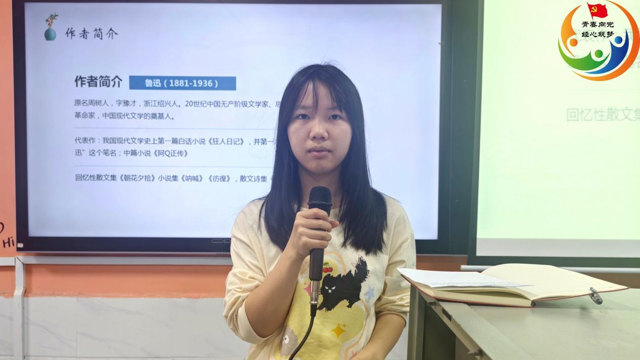 郑婷为大家分享了鲁迅的《朝花夕拾》这本书,“在那个风雨飘摇的旧时代,一位少年的成长足迹,究竟蕴含着怎样的家国情怀?往昔的人和事,又在作者心中激起怎样的波澜?”她说道,“我们通过鲁迅先生的视角了解他的一生,我们也可以写日记记录生活,很多年后它将会成为一本属于我们自己的《朝花夕拾》。”