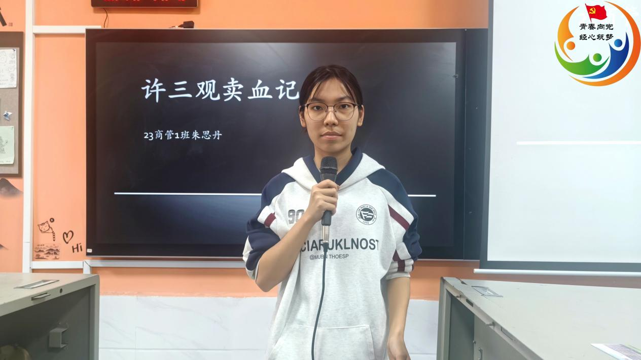“你能想象,一个普通人要怎样在生活的重压下,坚守对家人的责任吗?”23级商务管理1班朱思丹同学引用《许三观卖血记》中的典型片段,向大家介绍道。在那个物资匮乏的年代,生命的重量被一次次称量?!缎砣勐粞恰非∏〉莱隽苏夥萜椒踩说募崛陀胛按?。