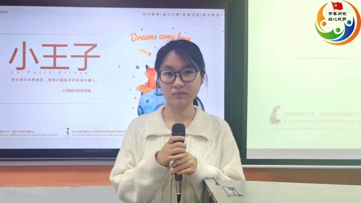 李思琪同学向大家分享了安托万·德·圣??怂张謇锏摹缎⊥踝印??!缎⊥踝印方彩隽死醋訠-612星球的小王子离开自己的星球后,在宇宙中旅行的故事。李思琪同学以小王子的经历告诉大家:在成长的道路上,无论世界如何复杂,都要保持内心的纯真与善良,坚守对美好的向往。