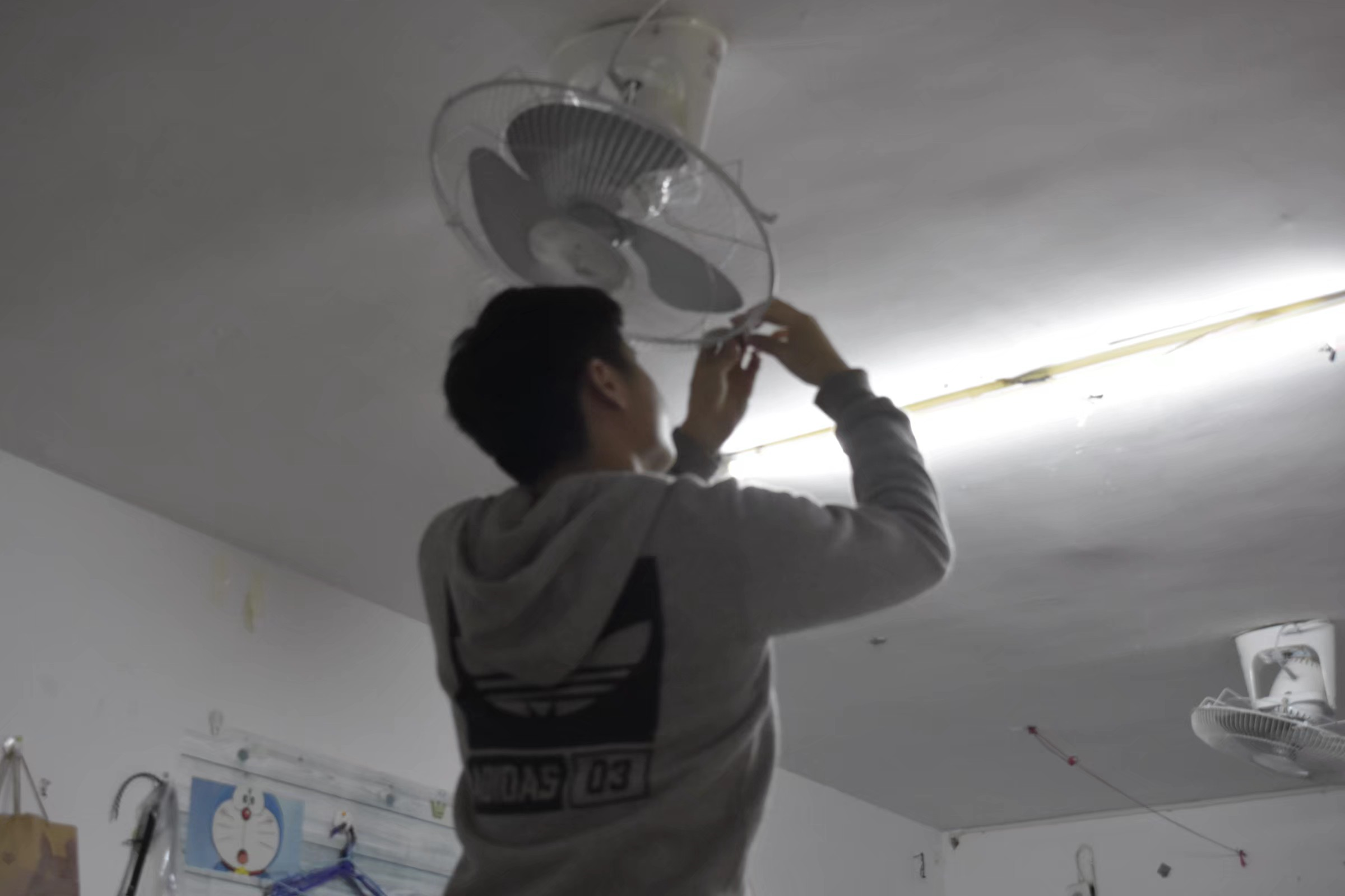 利用着身高优势帮助女孩子仔细擦拭布满灰尘的风扇