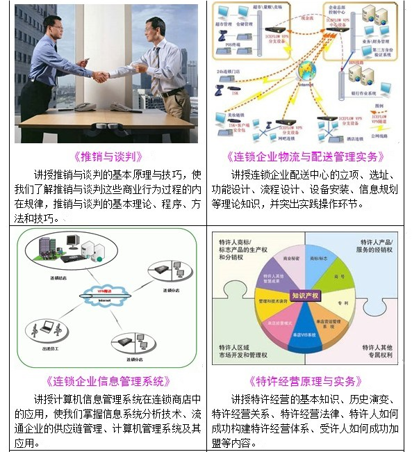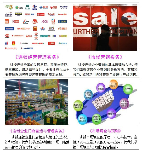 本专业根据连锁企业大卖场部门主管和连锁门店店长的岗位要求,按照人文素质???、专业基础能力??椤⒏谖涣唇蛹寄苣?椤⒆ㄒ低卣鼓芰δ?椤⒏谖皇迪澳?槲甯霾愦紊柚每纬?,实施“‘工学结合’模式下的多重层级??槭?rdquo;课程体系。该成果获得省高等教育教学成果二等奖。