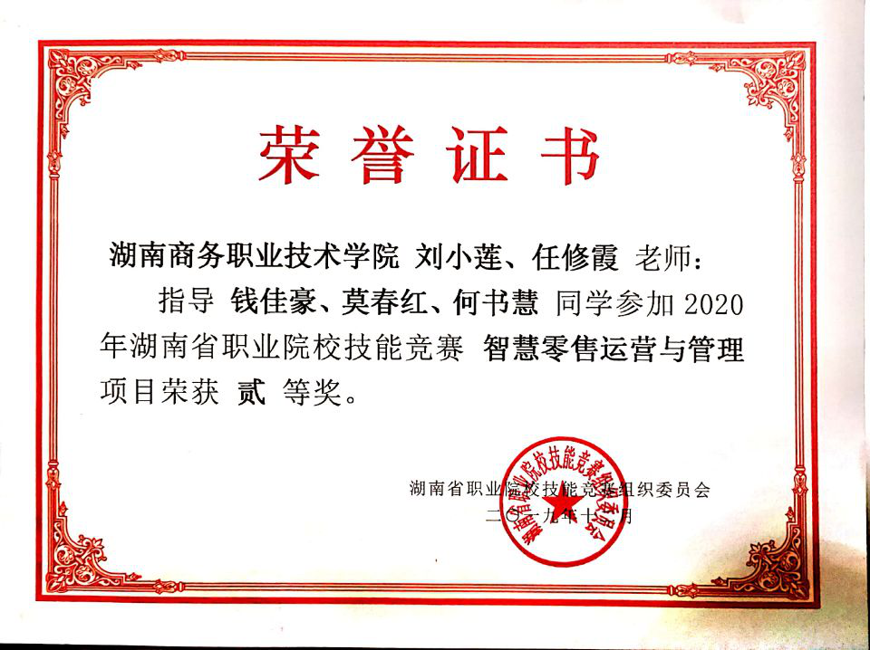 2016年获零售新星大赛全国一等奖,2017年获零售新星大赛全国三等奖,2018年获零售新星大赛全国三等奖,2019年获智慧零售与数据分析大赛全省二等奖。