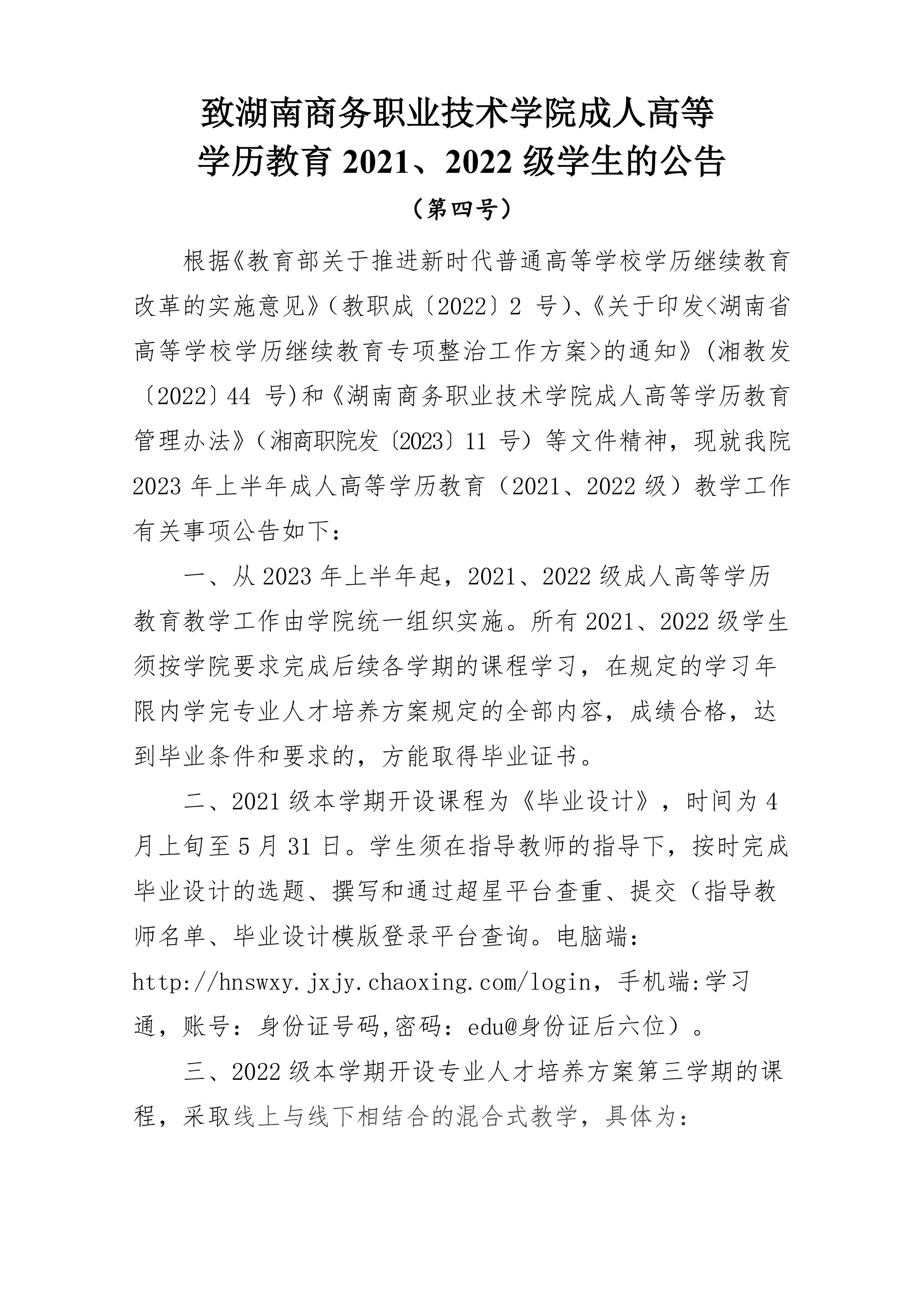 致湖南商务职业技术学院成人高等学历教育2021、2022级学生的公告(第四号)