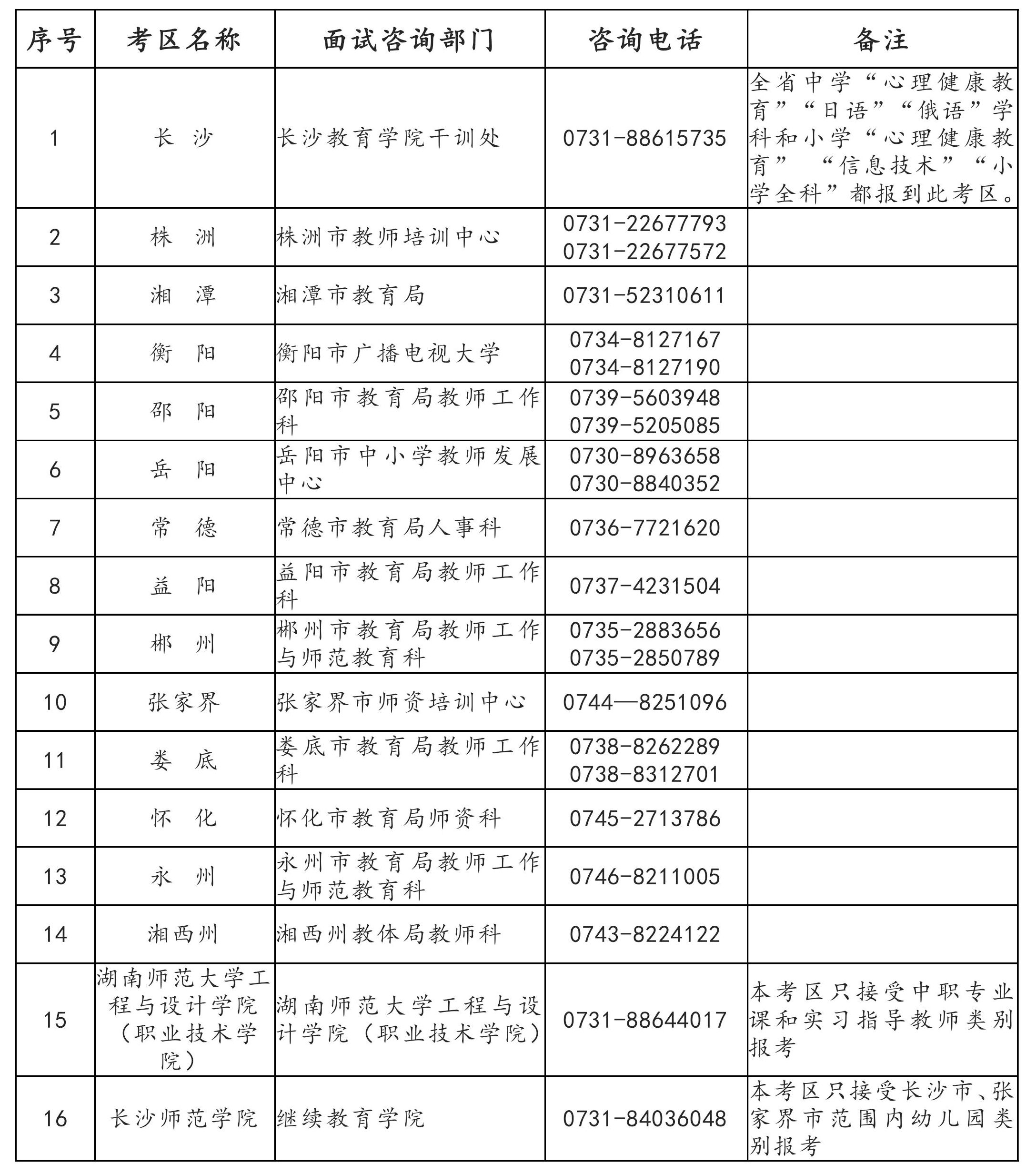 3.湖南省中小学教师资格考试(面试)各考区联系地址和电话如下表: