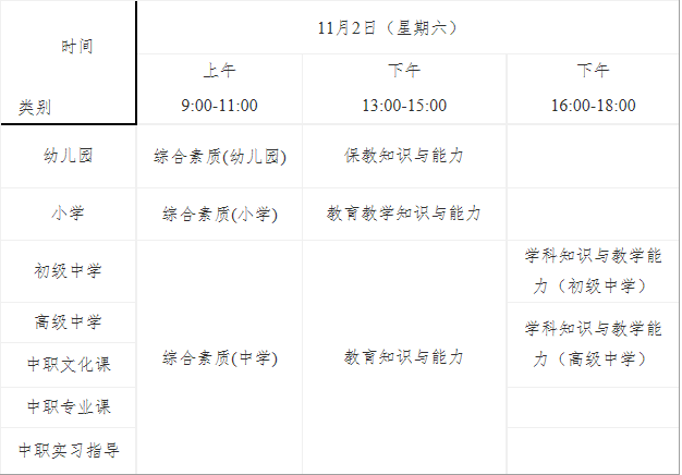 (四)全国统一考试时间为11月2日,各类别考试科目与时间安排如下:
