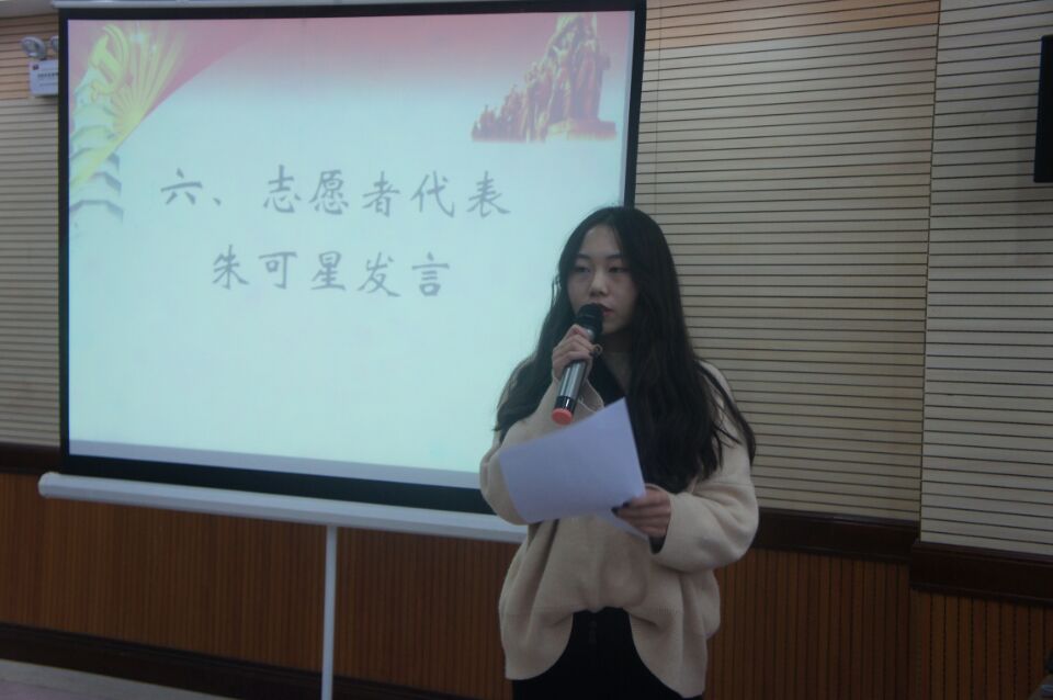 随后,志愿者代表16会计13班朱可星同学上台发言,首先他对学院能提供一个奉献着我的平台表示感谢,同时也感谢方冬玲老师对志愿活动的组织和指导。在回顾以前志愿活动之后,她认为在志愿活动中不只是志愿者给被帮助的人带去方便和快乐,他们还教会了许多在课堂上无法触及的知识和明悟。兼爱非攻,她表示以后会更加投身于各种志愿服务活动之中,将爱心永远传递。