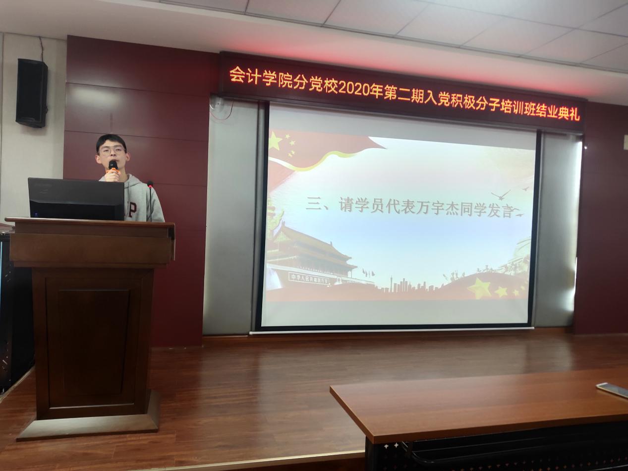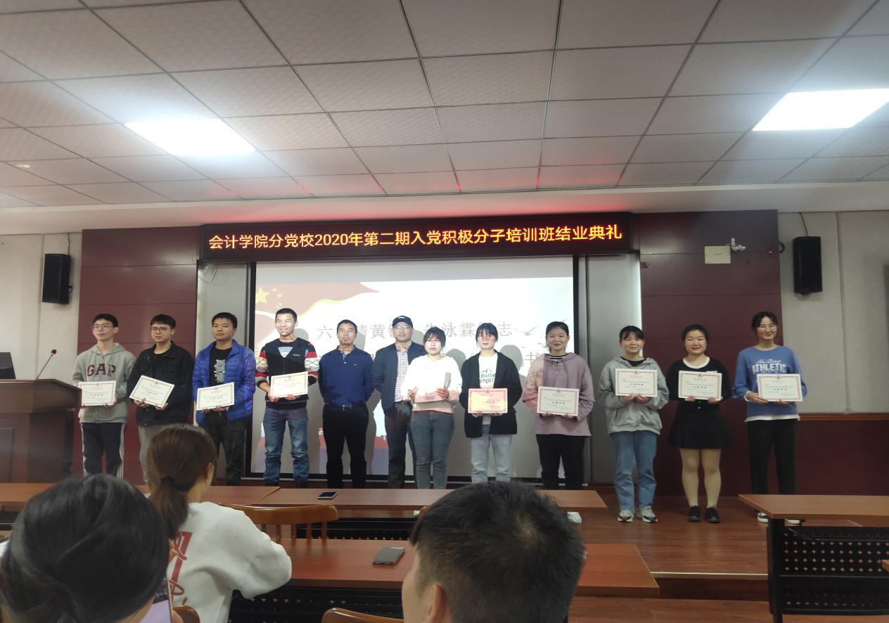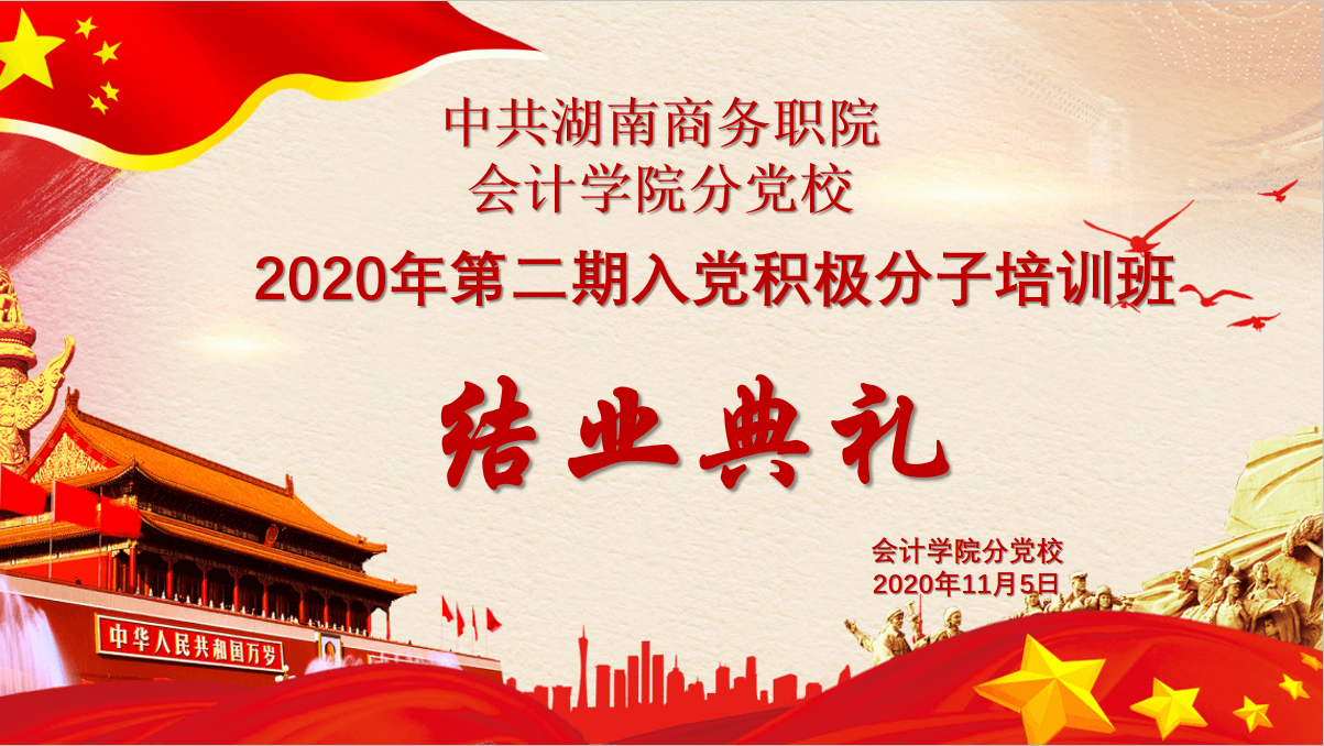 2020年11月5日中午12:30整,在二教201举行了中共湖南商务职业技术学院会计学院分党校2020第二期入党积极分子结业典礼。出席本次典礼的老师有会计学院党总支书记黄铖、学工一党支部书记朱泳霖以及全体第二期入党积极分子,本次典礼由黄姗姗主持。