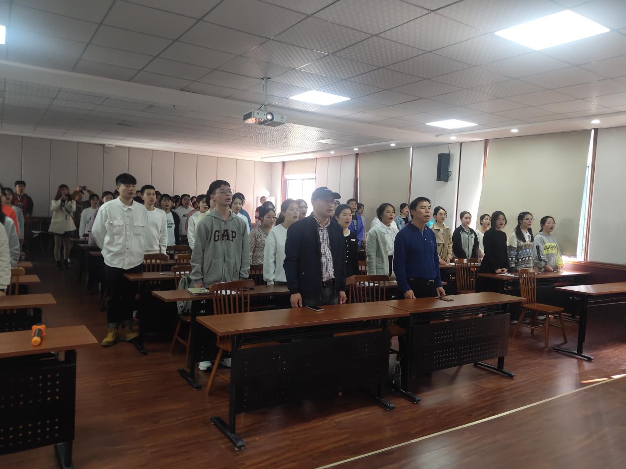 典礼第一项:全体老师同学起立,奏唱国歌