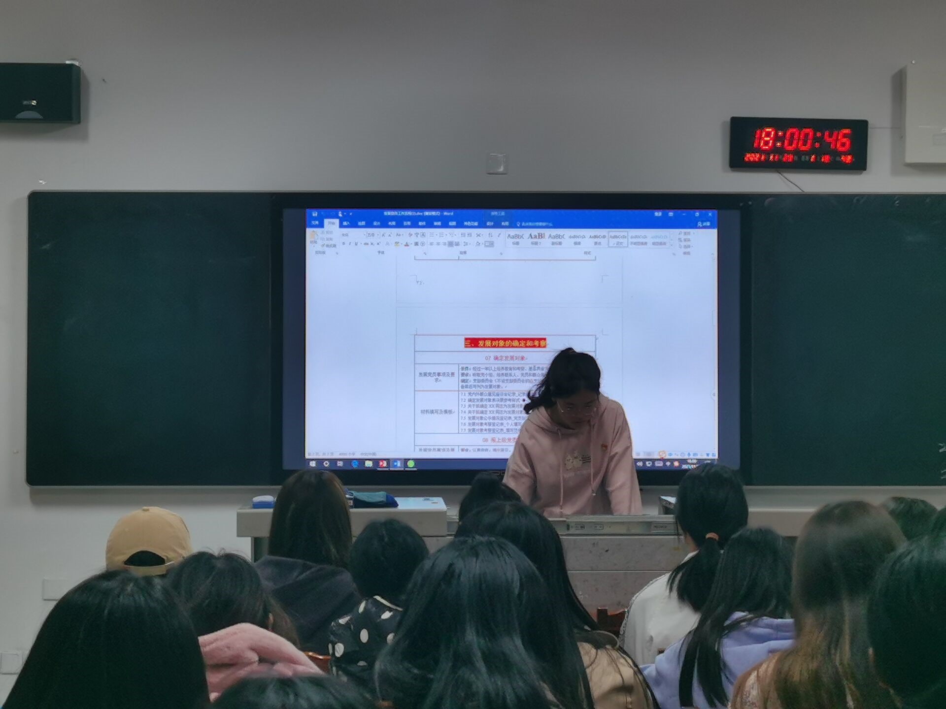 主持人对党员发展的每一个流程做了较为全面的介绍。党员发展的流程有如下五个重要阶段:入党申请人、积极分子、发展党员、预备党员以及正式党员。对于党员发展的流程,分别从成为每一阶段的条件、时间、所需提交资料、大概流程以及注意事项都做了详细的解说。希望所有的同志都能够严格要求自己,做好先锋模范带头作用。不忘初心、牢记使命。认真做好每一个阶段,认真对待每一份材料,认真听好每一次培训,提高自己对党的认识,加强自己对党的敬仰,提升自己的党性修养,在同学面前做好先锋模范带头作用。