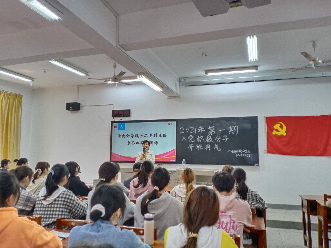 会计学院关工委副主任方冬玲同志在讲话时提到,通过对建党初期与现时代的生活对比来体现出党的领导的正确性与重要性,并提出希望所有学员能够端正入党动机,认真对待党的每一项任务,响应党的号召,做一名优秀的入党积极分子。