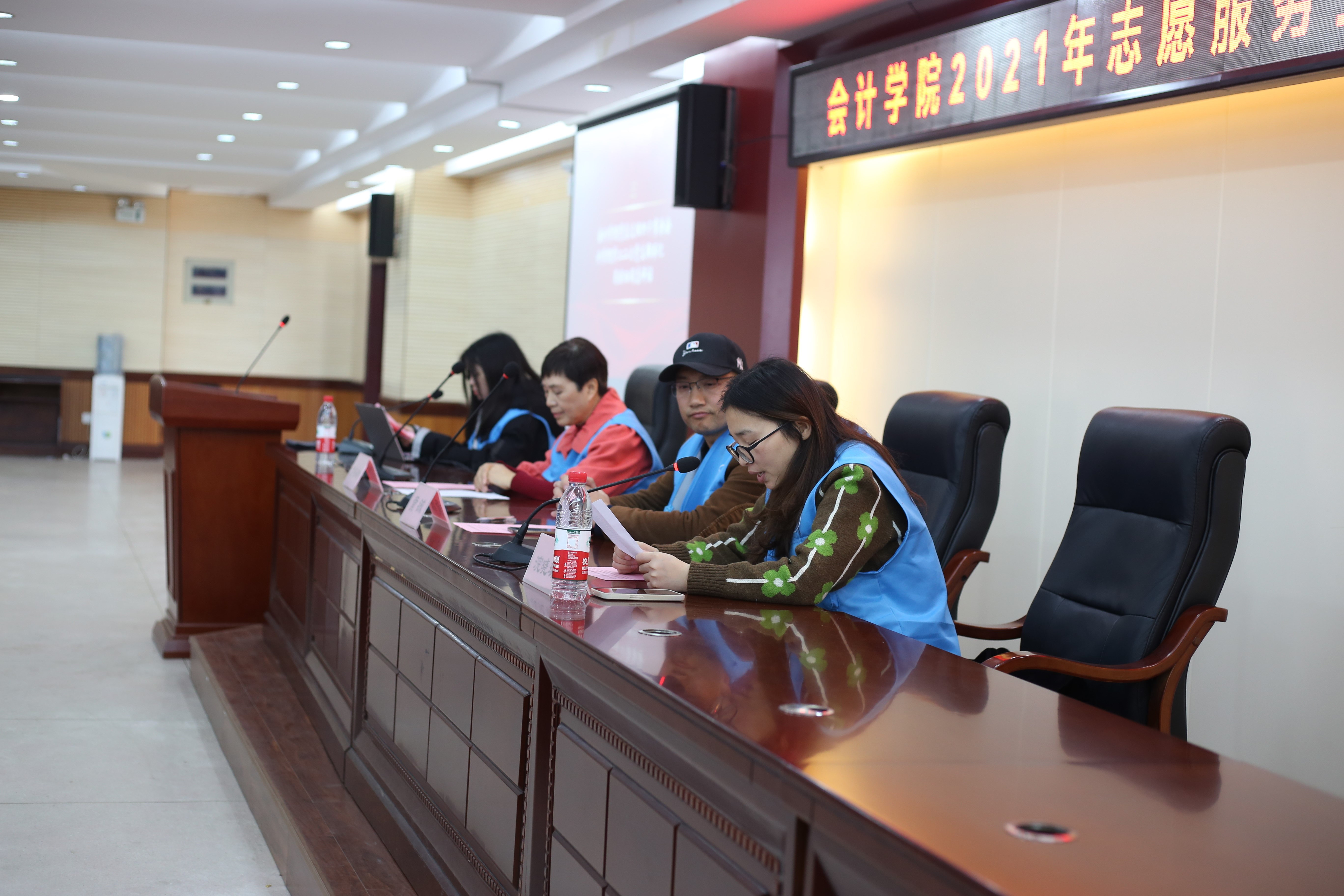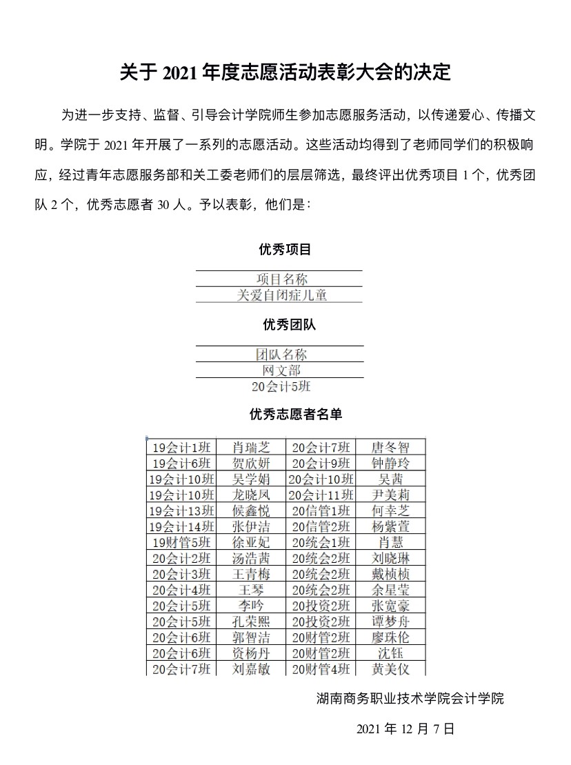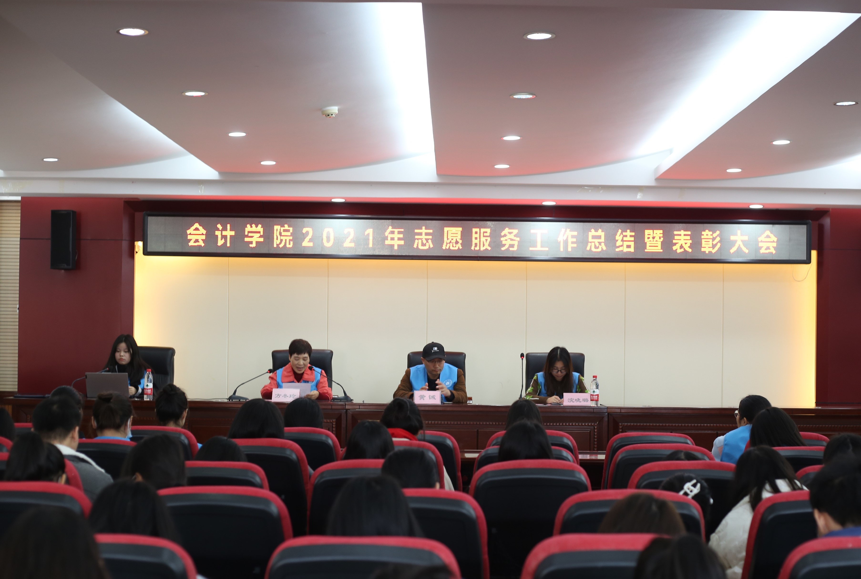 为弘扬奉献精神,激励更多同学参加志愿活动,会计学院于12月21日中午12:20在办公楼六楼学术报告厅举行会计学院2021年志愿服务工作总结暨表彰大会。党总支书记黄铖老师、学工二支部书记浣晓璐老师、关工委副主任方冬玲老师出席会议。青年志愿服务部部长唐敏娟担任主持人。优秀志愿者代表及团学分会相关部门成员参会。