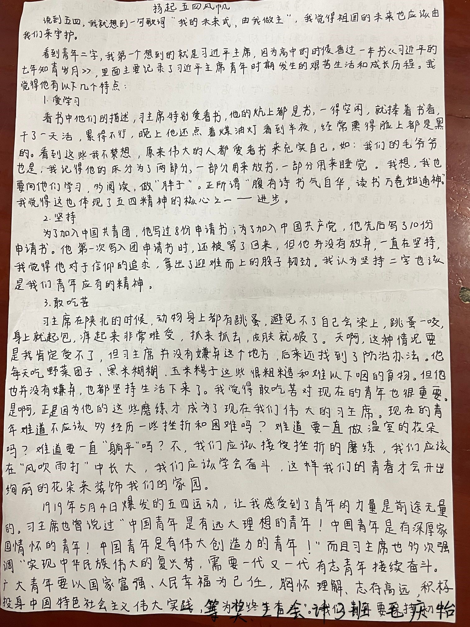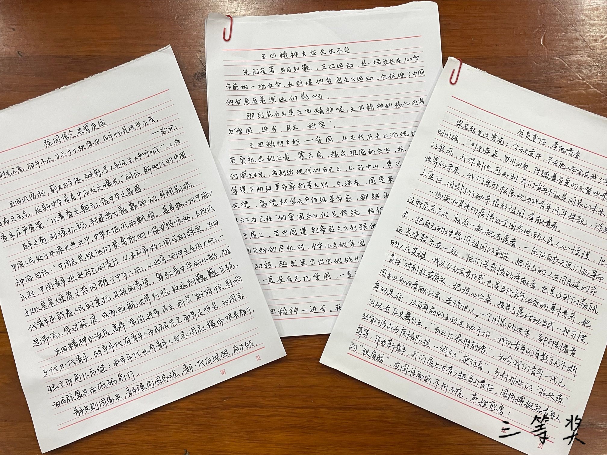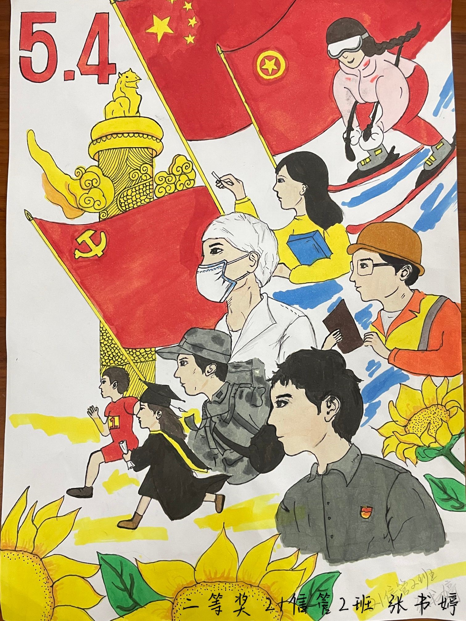 历时7天的作品准备,让同学们拥有足够充足的时间准备和修正参赛作品。选手们积极的收集关于五四运动、爱国英雄等相关资料,采用文字或绘画的形式将自己心中的想法和场景呈现出来。有的作品借以文字的形式述说着自己的爱国情怀,扬起五四风帆,祖国未来我守护;有的作品以图画勾绘着祖国的精彩、青年的未来。