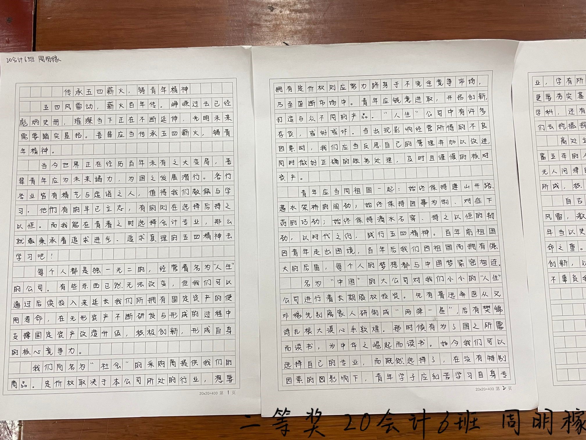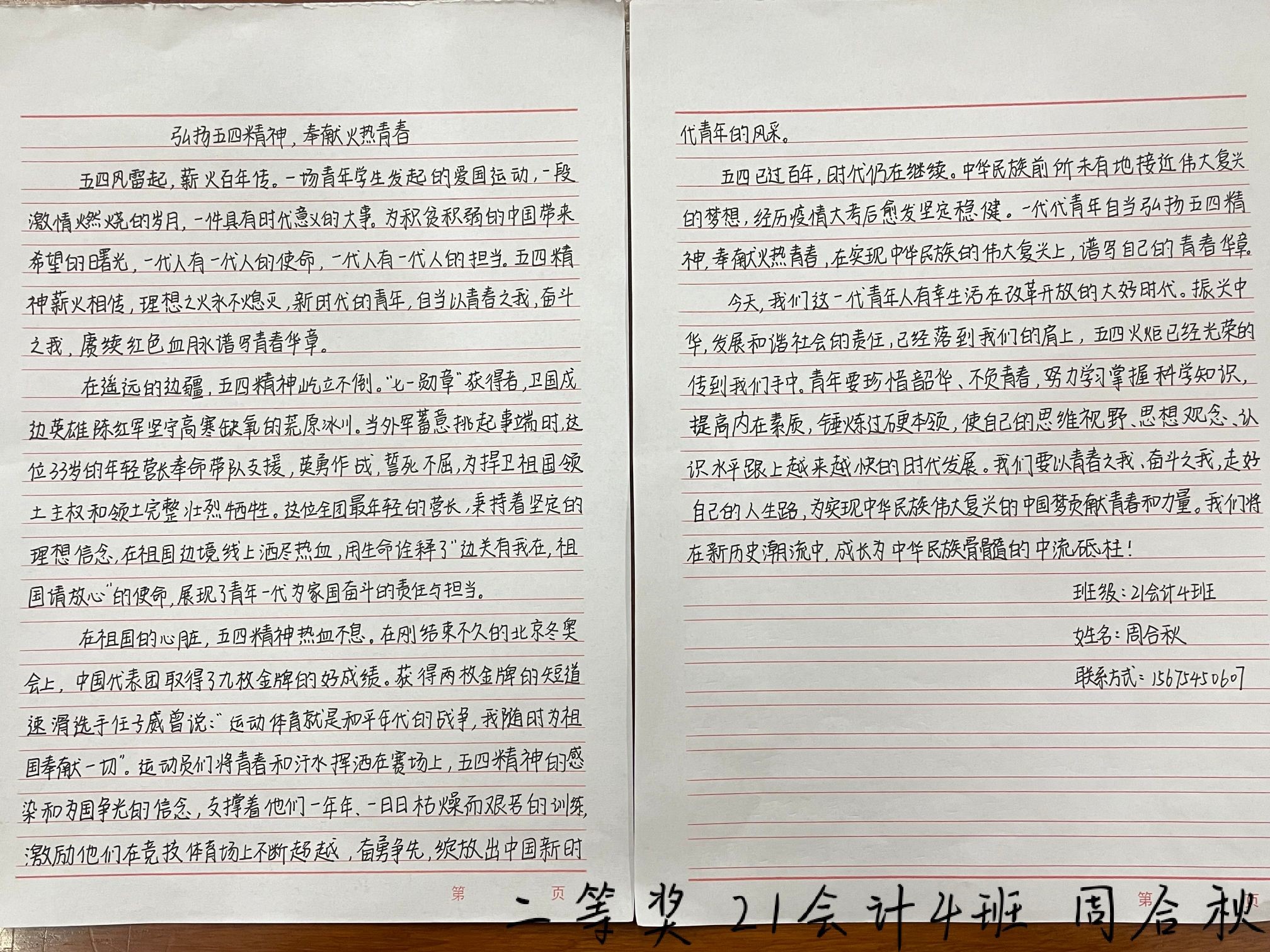 为弘扬五四精神,展示新时代新青年新面貌,营造良好的校园氛围,4月19—28日,会计学院青年发展部开展“弘扬五四精神,奉献火热青春”征文征画比赛。本次参赛对象为大一、大二全体成员。