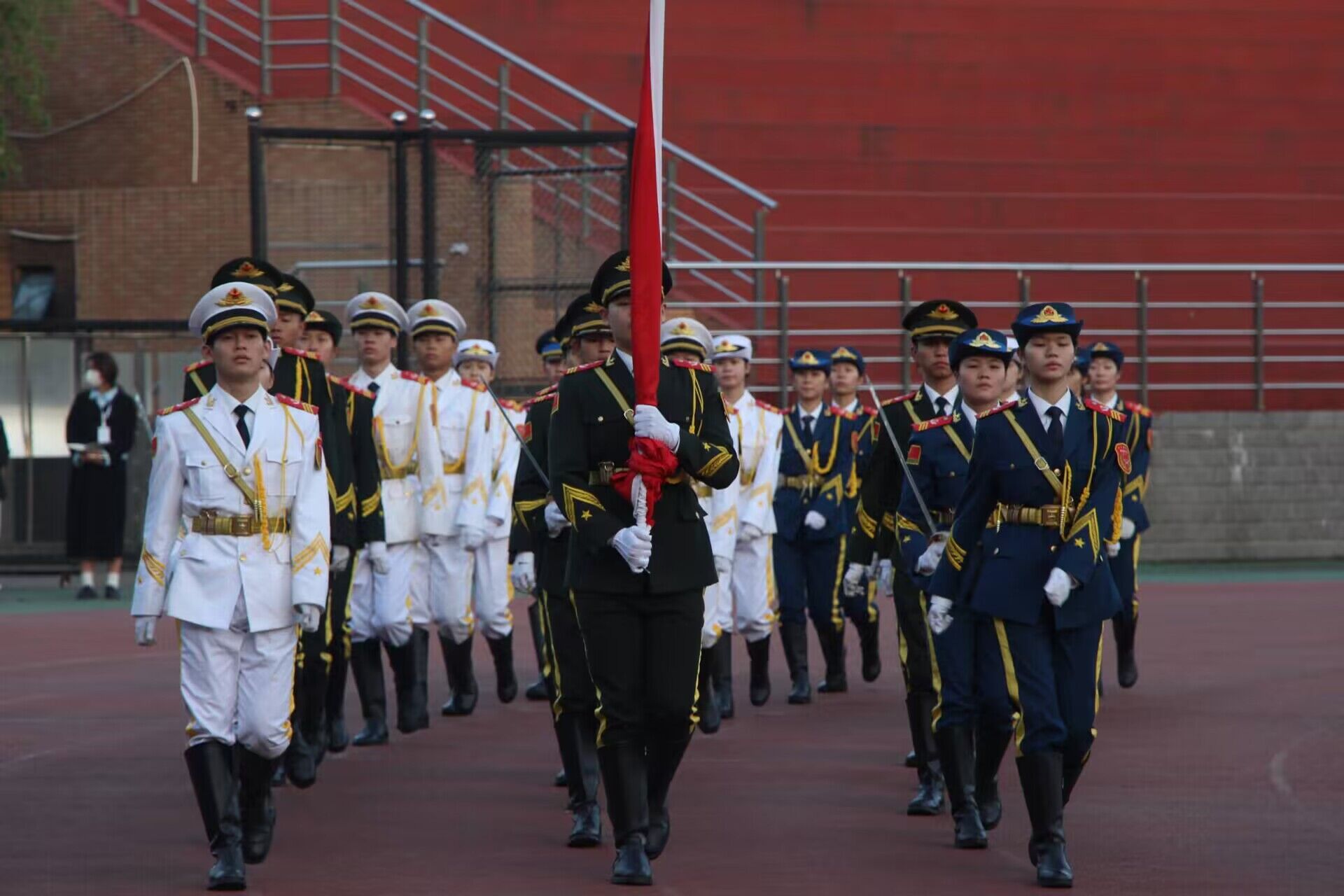 国旗护卫队的队员们迈着矫健整齐的步伐护送鲜艳的五星红旗入场,随着《义勇军进行曲》的响起,五星红旗在空中冉冉升起,全体同学目光坚定,仪式庄重肃穆。