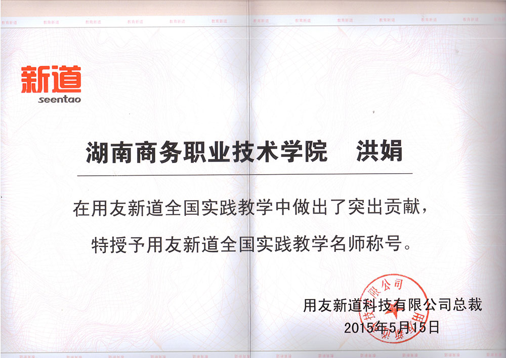 洪娟老师荣获2015年用友新道全国实践教学名师