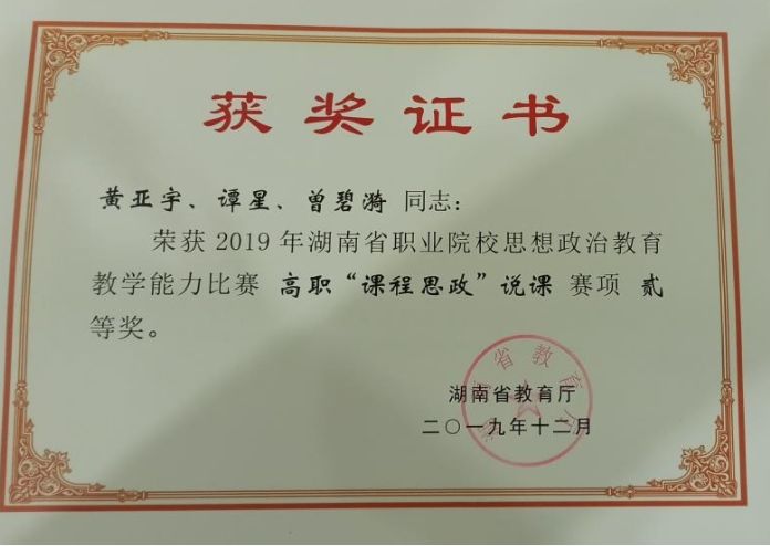 根据《关于举办2019年湖南省职业院校思想政治教育教学能力比赛的通知》精神,经校赛、市赛等初赛选拔,现场决赛于12月28日在长沙民政职业技术学院举行,经现场评比,我院黄亚宇老师获得高职《课程思政》说课赛项二等奖。