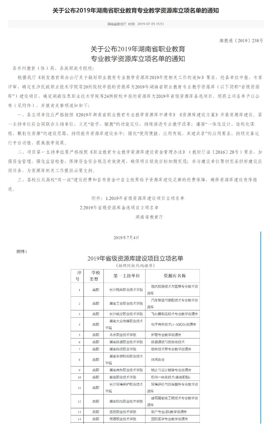 1.2019年统计与会计专业成功立项湖南省职业教育专业教学资源库;
