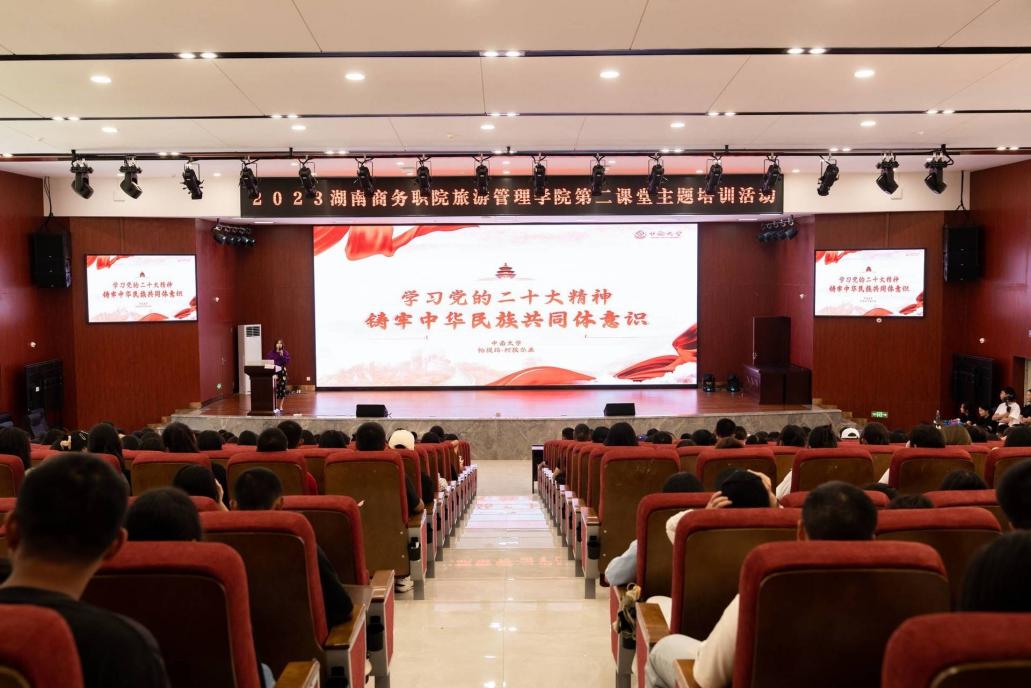 为学习贯彻习近平总书记关于加强和改进民族工作的重要思想,加深学生对民族文化的认识,铸牢中华民族共同体意识,9月19日下午,旅游管理学院邀请了中南大学学生工作部(处)少数民族学生事务办公室主任、“56度中南工作室”主持人帕提玛·柯孜尔亚老师开展以“学习党的二十大精神,铸牢中华民族共同体意识”为主题的第二课堂培训活动?;疃裳г旱匙苤Ц笔榧桥费粜蚧鞒?,全体辅导员及2023级新生参加。