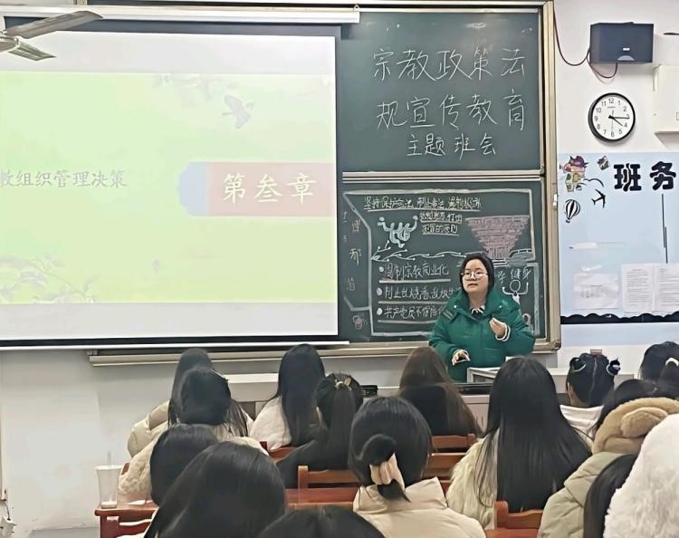 为深入贯彻党的民族政策和宗教工作方针,提高学生正确认识和对待宗教问题的能力,旅游管理学院22旅管3班于12月20日下午在第一教学楼209举行了以“宗教政策法规宣传教育”为主题的班会。