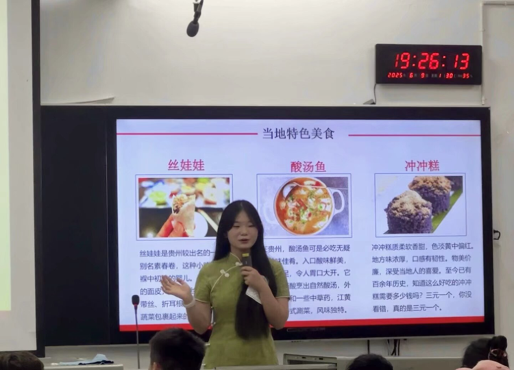 决赛现场气氛热烈,各参赛团队聚焦家乡特色,综合运用专业知识,通过PPT讲解、视频展示、实物呈现等多种形式,生动诠释了家乡的自然景观、民俗风情、历史底蕴与特色物产。其中,23旅管3班任雅娟、玛丽娅团队以“多彩贵州”为主题,不仅展示了壮丽的山水风光和诱人的特色美食,更深入解析了苗族银饰的精湛锻造工艺,并融入悠扬的侗族歌曲元素,全方位展现了贵州丰富的文化旅游资源和独特魅力,赢得了现场观众的阵阵掌声。评委们从内容创意、专业结合度、表达能力、现场效果等多个维度进行了综合评审。