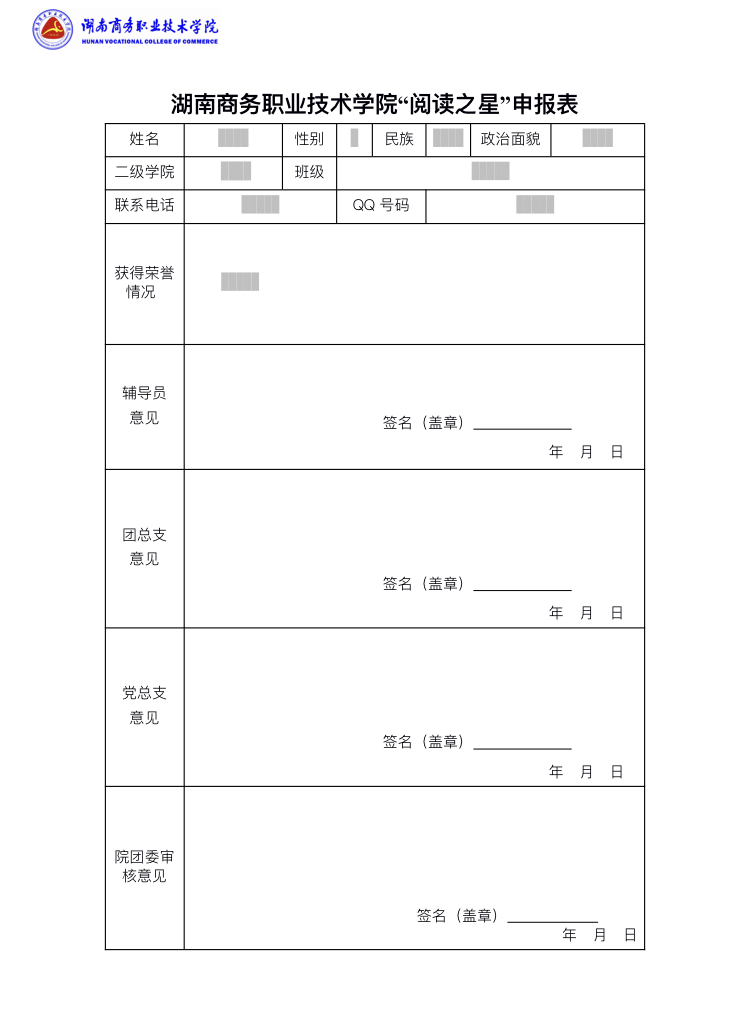 湖南商务职业技术学院“阅读之星”申报表