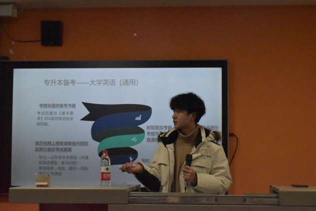 虞昌,现为湖南工商大学外国语学院专业的学生,他以“用最努力的心,做到不负韶华”为主题为商英专业的同学们讲解了一些班级管理方法、学习考证计划及专升本的相关经验。结合亲身经历,他鼓励学弟学妹们在学习和生活上要勇于挑战自我,并尽可能的实现自身的最大价值。