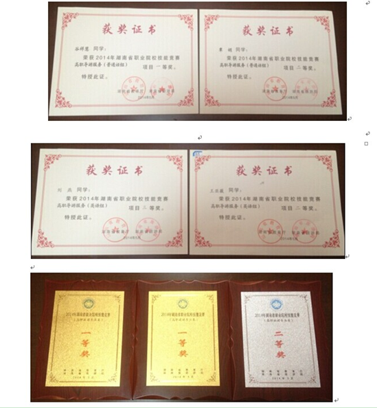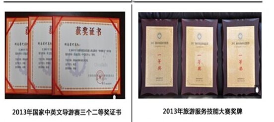 在2013年湖南省职业院校中英文导游技能赛上获一等奖三名、二等奖名,同年代表湖南省参加国家职业院校学生技能赛获得三个二等奖,创湖南省最好成绩。2014年再创佳绩,获省职业院校技能赛中英文导游赛一等奖一个,二等奖两个,三等奖一个。