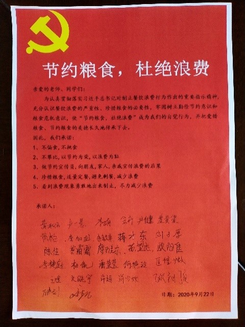 活动的最后一项,全体党员同志在“节约粮食,杜绝浪费”承诺书上签字,党员同志带头倡导节约粮食,从自身做起。