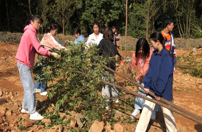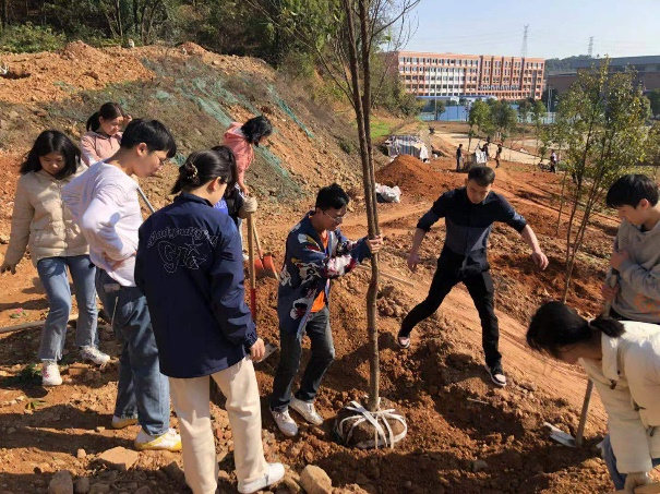 活动中,大家分工明确,齐心协力,教师党员与同学们共同协作完成树苗的栽种,呈现出一派热火朝天的劳动场面。