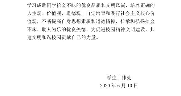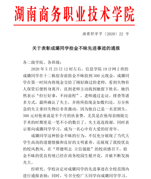 关于表彰成璐同学拾金不昧先进事迹的通报