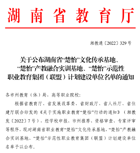 为推动职业教育与区域产业紧密对接、有效服务湖南经济社会高质量发展,湖南省教育厅、省发改委等五部门联合发布了《关于实施职业教育“楚怡”行动的通知》。12月1日,湖南省教育厅公布了湖南省“楚怡”产教融合实训基地建设单位名单,我院申报的人工智能应用创新产教融合实训基地成功立项。
