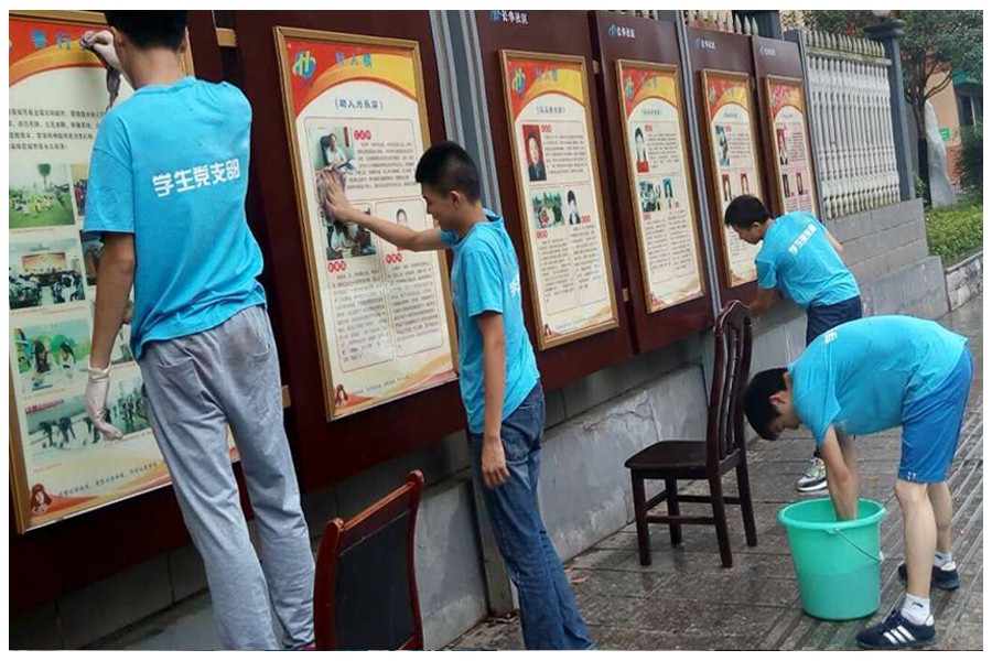 7月2日,在义务维修活动进行中,9名学生党员分出一支小分队,对长华社区卫生进行清扫。天下起了蒙蒙细雨,同学们身着雨衣,手拿劳动工具,对地面上的垃圾、墙上和公告栏上的小广告进行清除,并对社区的公共设施除尘除渍。