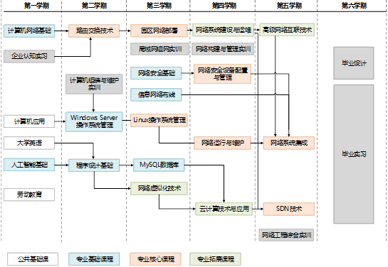 主干课程包含:路由交换技术、园区网络部署、网络运行与维护、网络安全设备配置与管理、网络系统集成、Windows Server操作系统管理、Linux操作系统管理、SDN技术、网络虚拟化技术、云计算技术与应用、高级网络互联技术等。