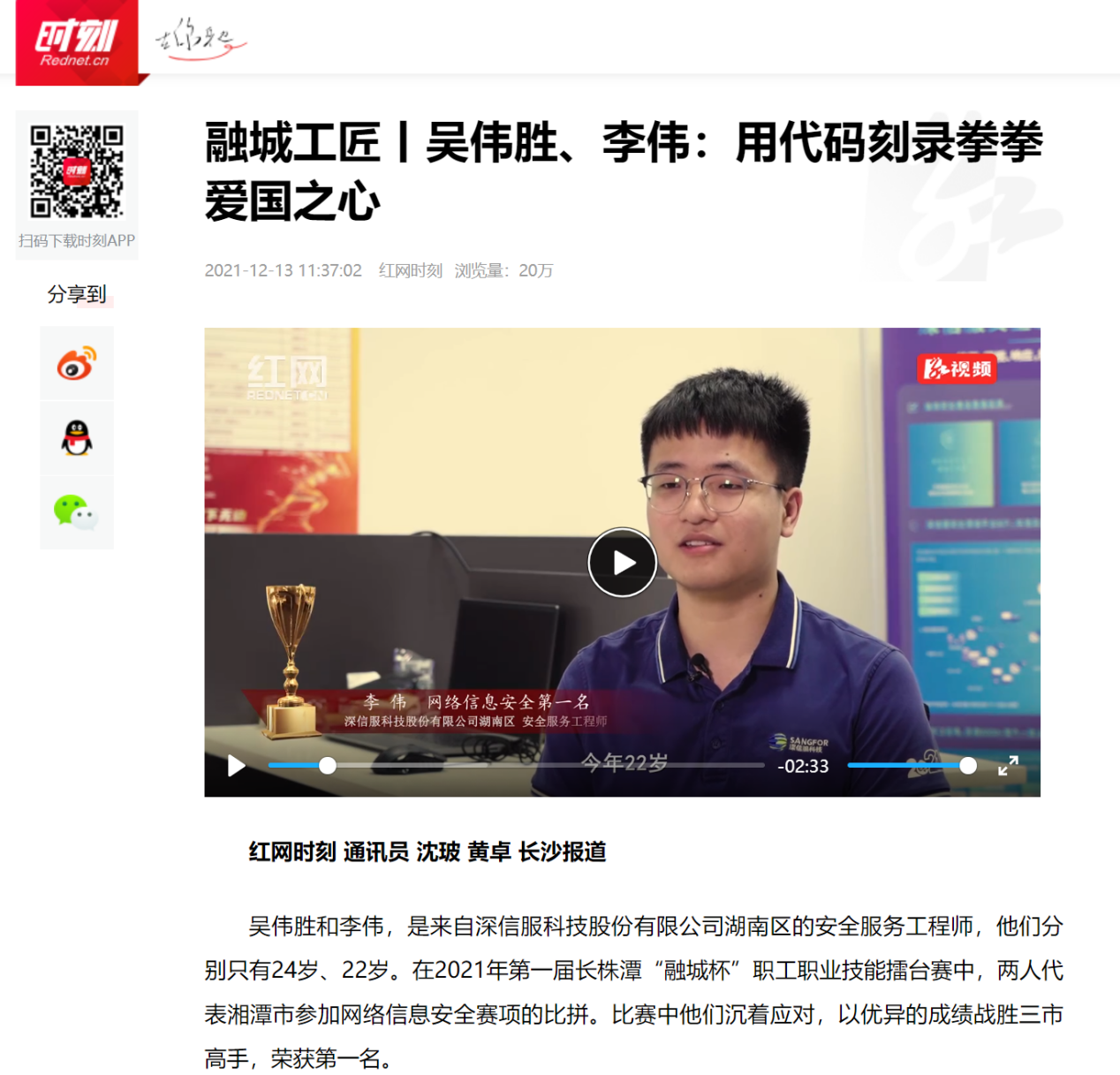 18计网2班李伟同学,于2021年入职深信服科技股份有限公司湖南区的安全服务工程师,在2021年第一届长株潭“融城杯”职工职业技能擂台赛中,代表湘潭市参加网络信息安全赛项的比拼。以优异的成绩战胜三市高手,荣获第一名。