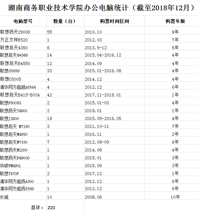 湖南商务职业技术学院办公电脑统计(截至2018年12月)