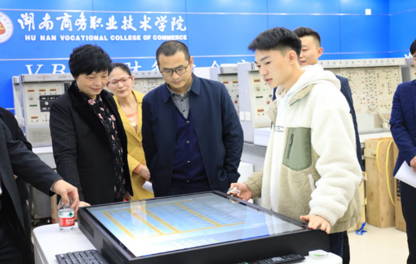 2021年3月26日下午,湖南省教育厅职成处刘彦奇副处长及黄中培主任两位专家莅临我院,实地调研考察我院省级示范性 “数智财务虚拟仿真实训基地”申报的建设基础等指导工作。学院院长李定珍、副院长易兰华陪同调研。
