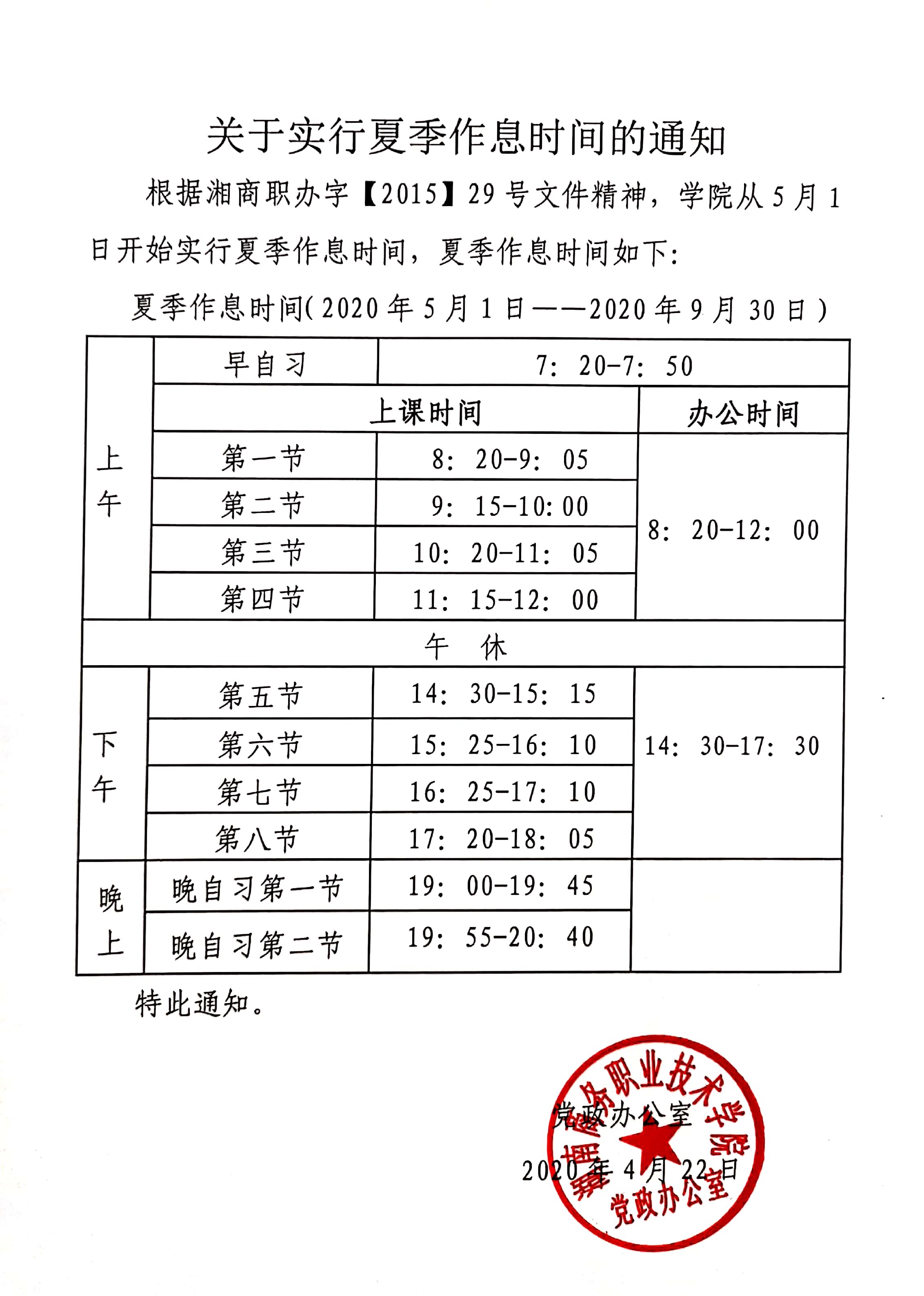 学院夏季作息时间表