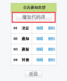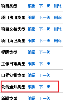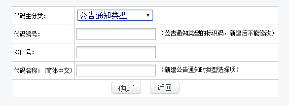 2)新建公告时的公告通知类型,系统管理员的账号可在系统管理->系统代码设置->增加代码主分类中找到“公告通知类型”,点击“下一级”来增加公告通知的类型。如图所示: