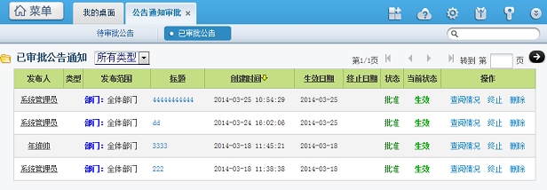 注:不需审批的公告,任何时候发布人和有管理权限的用户都可以终止公告。 需要审批的公告,已经提交审批或者审批通过,发布人和审批人都不能删除、修改、终止公告。
