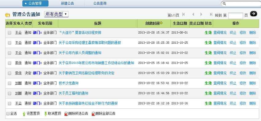 行政办公->公告通知管理的“公告管理”功能,主要是对发布的公告进行修改、删除、终止等操作。