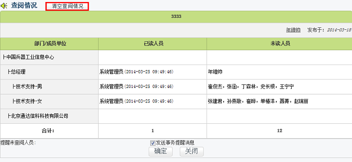 若发布的公告需要审批,则审批人在行政办公->公告通知审批中,可以看到待审批的公告和已审批的公告,还可以通过点击“查阅情况”查看发布公告以后用户的查阅情况并通过事务提醒的方法提醒未查阅的人员,如果经过修改重新发布的公告则清空查阅情,如图所示: