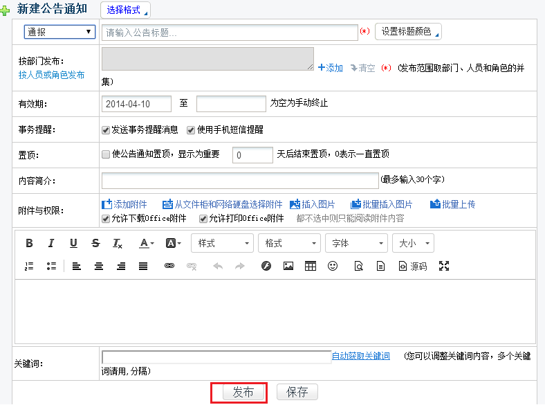 有“公告通知管理”菜单权限,在行政办公->公告通知管理中,点击“新建公告”可以发布公告信息。如图所示: